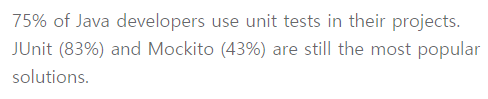 Intellij를 만든 JetBrain 사에서 조사한 결과 단위 테스트를 하는 개발자는 75%고 그 중 JUnit을 사용하는 개발자는 2019년엔 93%, 2020년엔 83% 라고 하네요. 1년 사이에 10%나 줄었네요. (어떤 걸로 이동했나 궁금...)