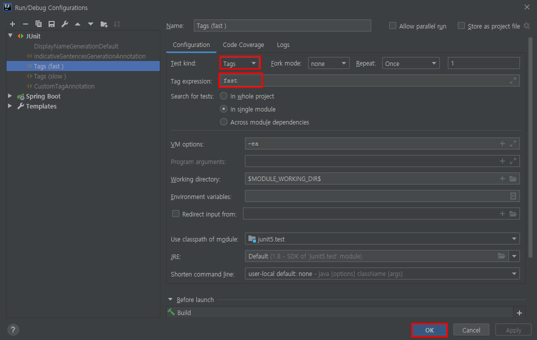 2. Test kind를 Tags로 변경 -> Tag expression에 Fast 입력 -> OK