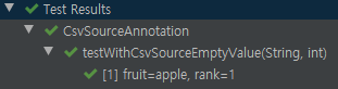 | @CsvSource({ "apple, ''" }) | "apple", "" |