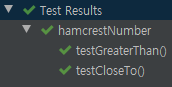 | closeTo(double operand, double error) | 테스트할 값과 operand의 오차가 error 이하인지 테스트 테스트 값 - operand <= error TRUE |