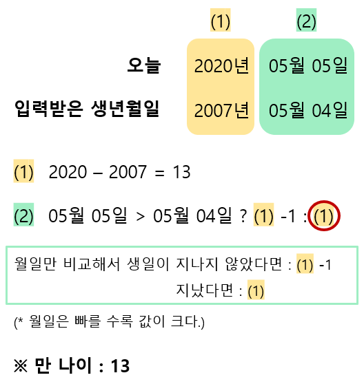정의를 이용해서 생년월일이 2007년 05월 04일인 사람의 만 나이를 구해보면 아래와 같다.