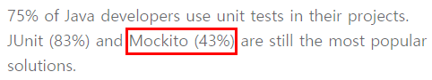 유닛 테스트를 할 때 사용하는데 JetBrains이 발표한 2020년 통계에 따르면 유닛 테스트를 하는 자바 개발자 중 43%가 mockito를 사용하고 있다고 합니다. 음 그럼 나머지들은 어떤 걸 쓰고 있는지 궁금하네요. (mockito와 같은 mock 프레임워크는 EasyMock, JMock이 있습니다.)