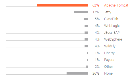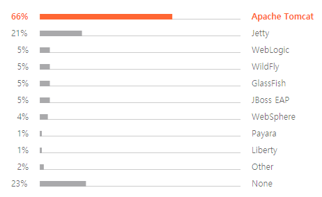 역시 Apache Tomcat이 가장 많이 사용되고 있고 1년 사이에 4%가 올랐네요. Jetty도 4%가 올랐습니다.