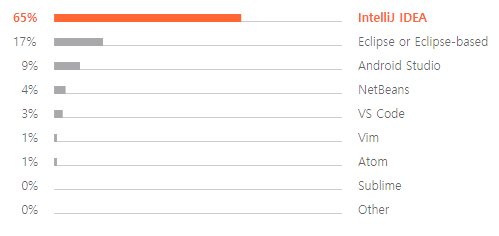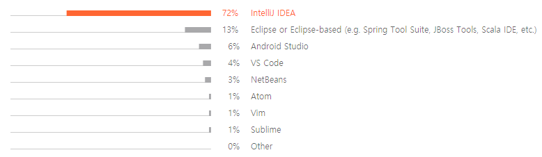 IntelliJ가 역시 점점 인기가 많아지면서 7%나 올랐네요. 역시 최고