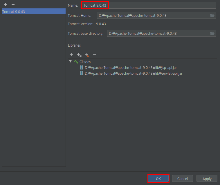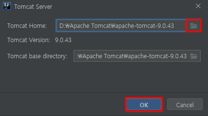3. 폴더 아이콘 클릭 -> 위에서 설치한 톰캣 경로 선택 -> OK 클릭