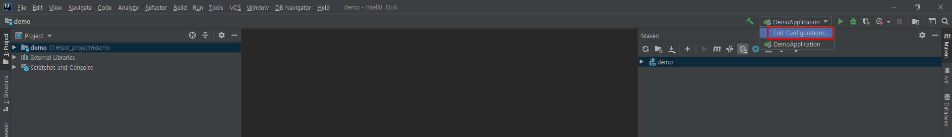 5. 상단 오른쪽 Run Configuration 클릭 -> Edit Configurations 클릭