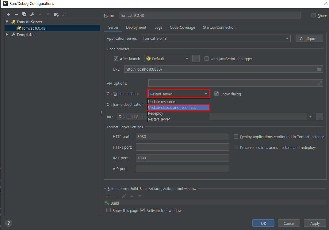2. On 'Update' action -> Update classes and resources 클릭 -> OK 클릭
