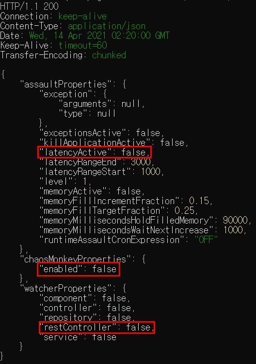 조회해보면 현재 카오스 멍키, latencyActive, restController watcher가 비활성화 되어있는 걸 볼 수 있습니다.