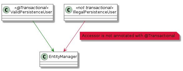 illegalPersistenceUser 클래스는 EntityManager를 상속받으면서 @Transactional 어노테이션이 없어 테스트 실패가 납니다.