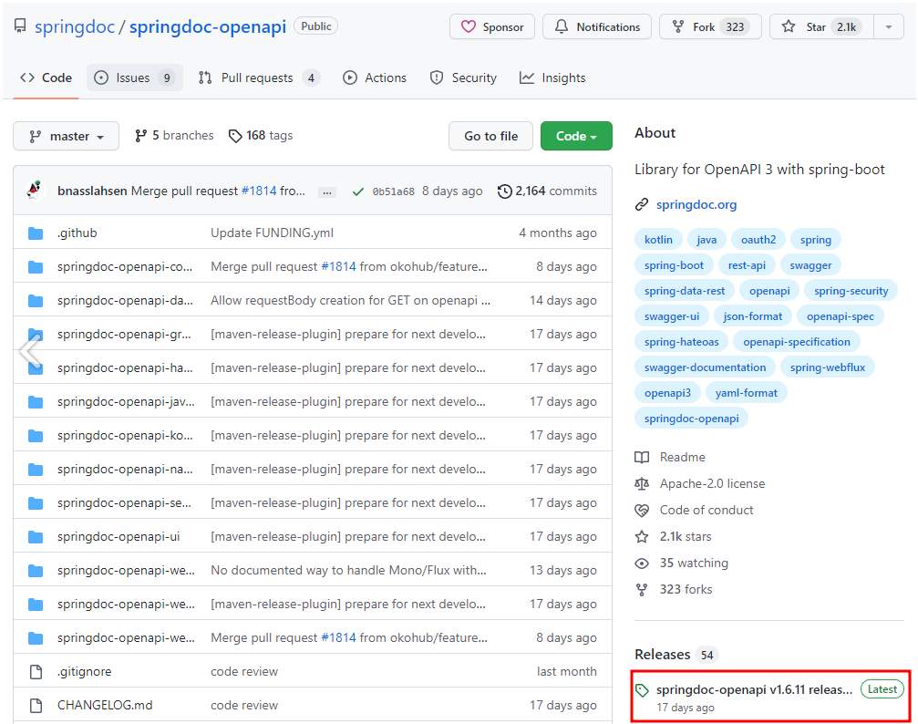 이에 비해, springdoc-openapi는 17일 전에도 버전 업데이트를 했다.