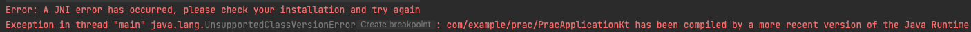 Exception in thread "main" java.lang.UnsupportedClassVersionError: com/example/prac/PracApplicationKt has been compiled by a more recent version of the Java Runtime (class file version 53.0), this version of the Java Runtime only recognizes class file versions up to 52.0