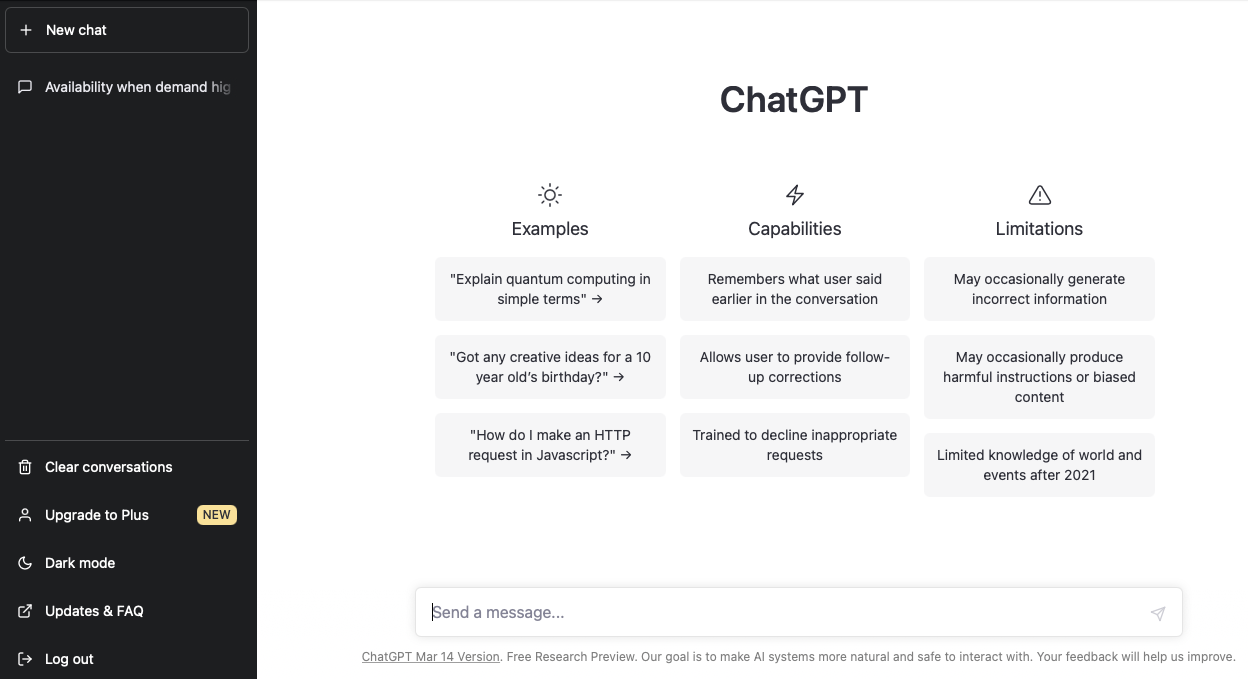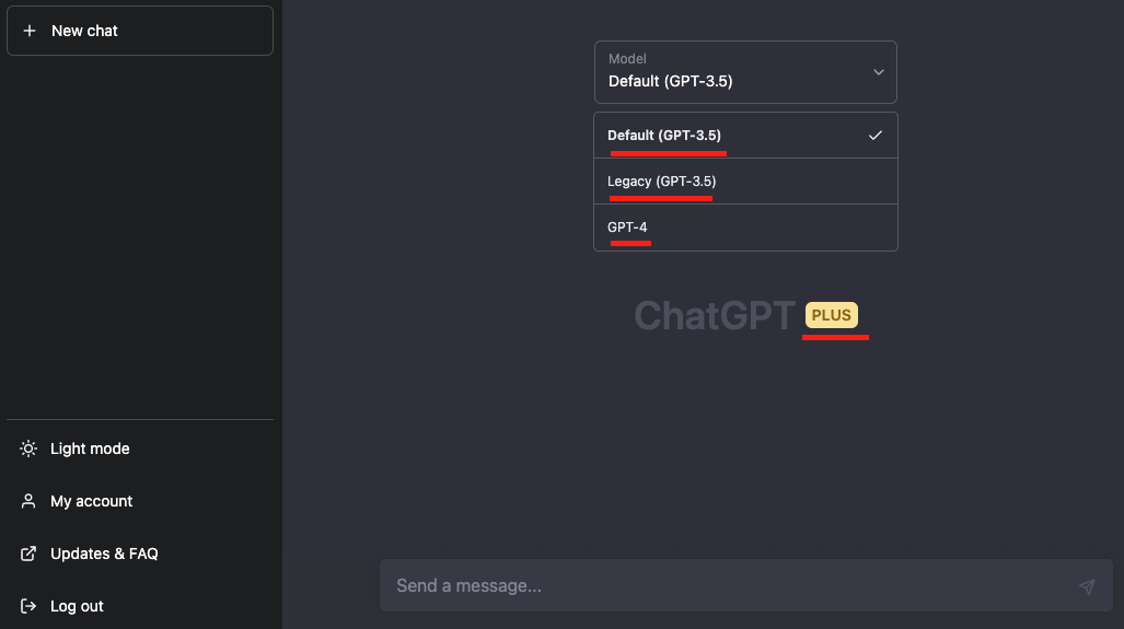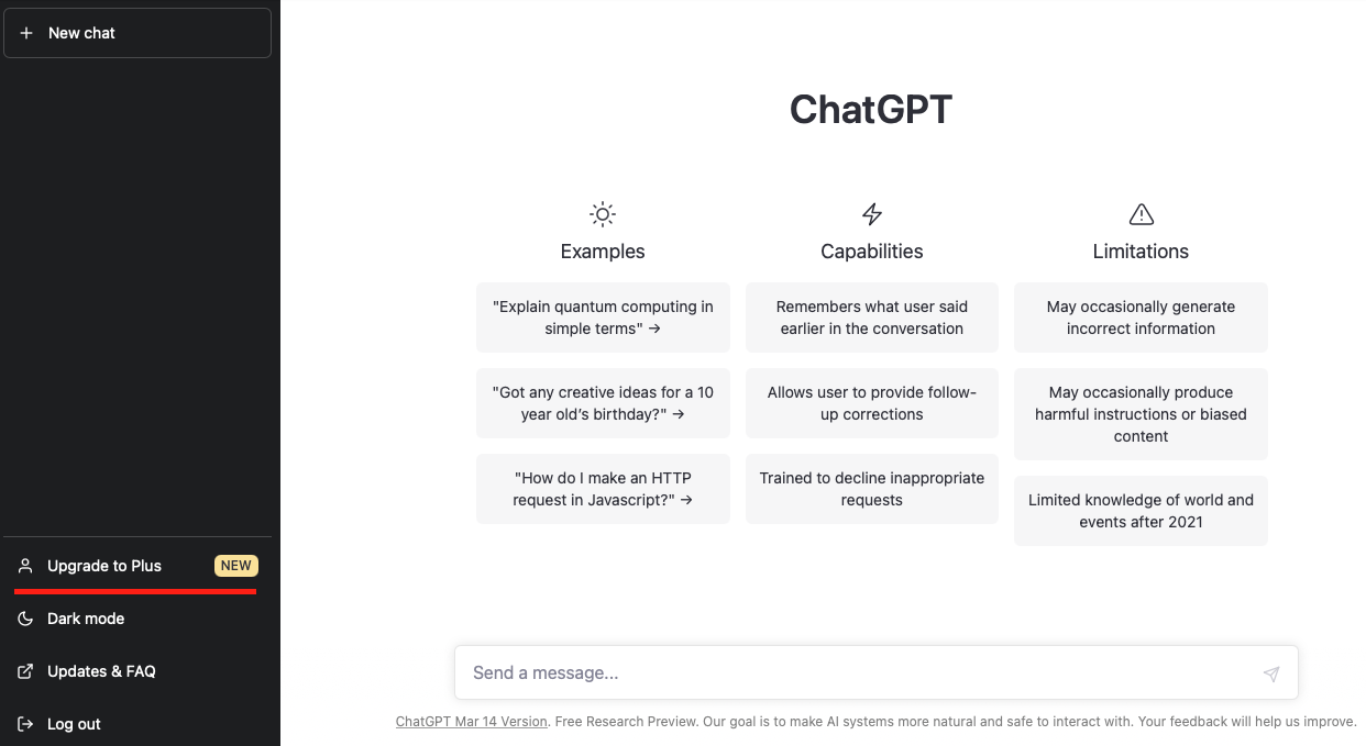 ChatGPT에 접속해서 로그인하면 아래와 같은 화면이 나오는데 왼쪽 하단에 있는 "Upgrade to Plus"를 누른다.