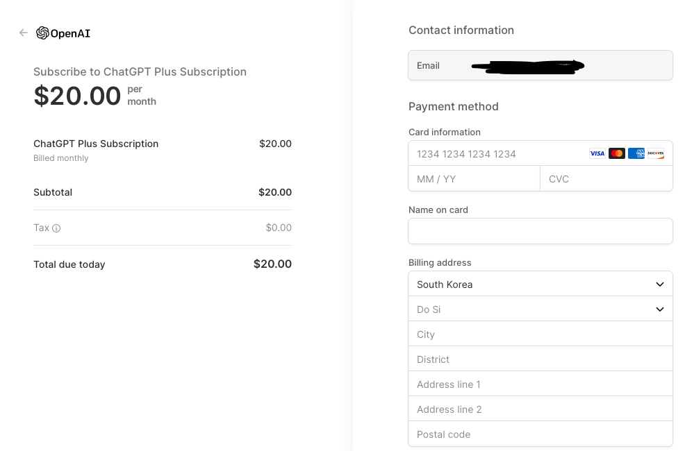 카드 정보를 입력해주면 된다. 구독형이라 매달 20$씩 결제되니 이점 유의하자.