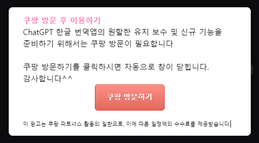 방금 컴퓨터로 ChatGPT를 쓰려고 사이트에 들어갔는데 갑자기 아래처럼 쿠팡 파트너스가 나오고 클릭하라고 한다.