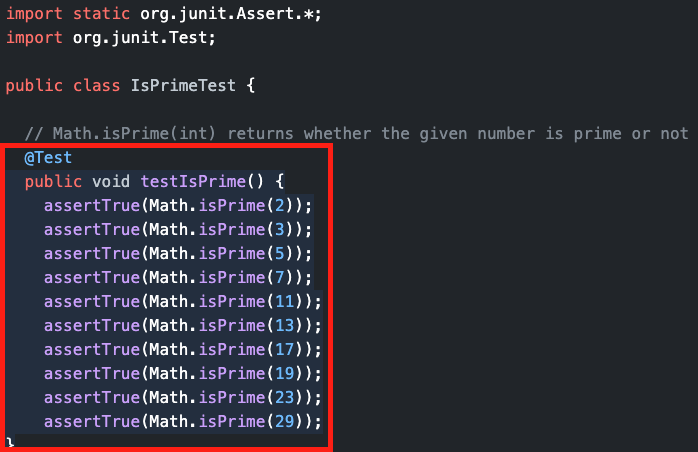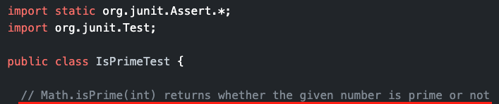 자바 라이브러리인 Math.isPrime(int)의 테스트를 작성하고 싶어서 IsPrimeTest 클래스 안에 위와 같은 주석을 작성하면?
