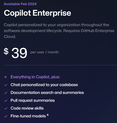 Copilot Enterprise는 2024년 2월에 나오는 새로운 기업 요금제다. 월 39$다. 2월에 나온다고 바로 사용할 수 있는 게 아니라 사용 요청을 하고 대기해야 한다.