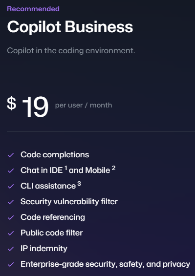 Copilot Business는 기업에서 쓰는 요금제다. 월 19$다. Team, Enterprise 깃 계정이 있어야 구매 가능하다.