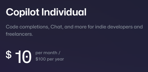 Copilot Individual은 개인이 쓰는 요금제다. 첫 달은 공짜고 그 다음부터 월 10$다. 연간권은 20$ 할인해줘서 100$다.