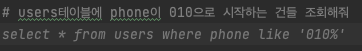주석으로 phone이 010으로 시작하는 건들 찾아달라고 했더니 바로 쿼리를 만들어준다.
