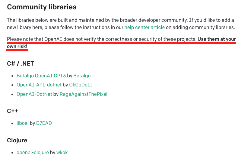 그럼 다른 언어들은 어떻게 하나? 다행히도 일반인들이 만든 라이브러리 중 OpenAI가 검토한 언어별 라이브러리를 공유해준다.