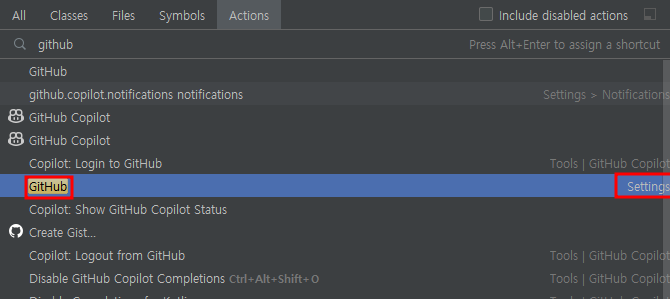1. Actions 조회 창 -> gitub 입력 -> Settings에 있는 GitHub 클릭