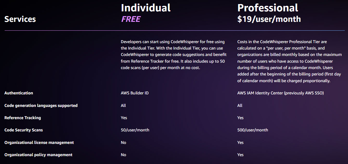 Amazon CodeWhisperer provides developers with real-time code suggestions directly in the integrated development environment (IDE). Individual developers can use CodeWhisperer for free. Organizations pay a flat “per user, per month” subscription fee for