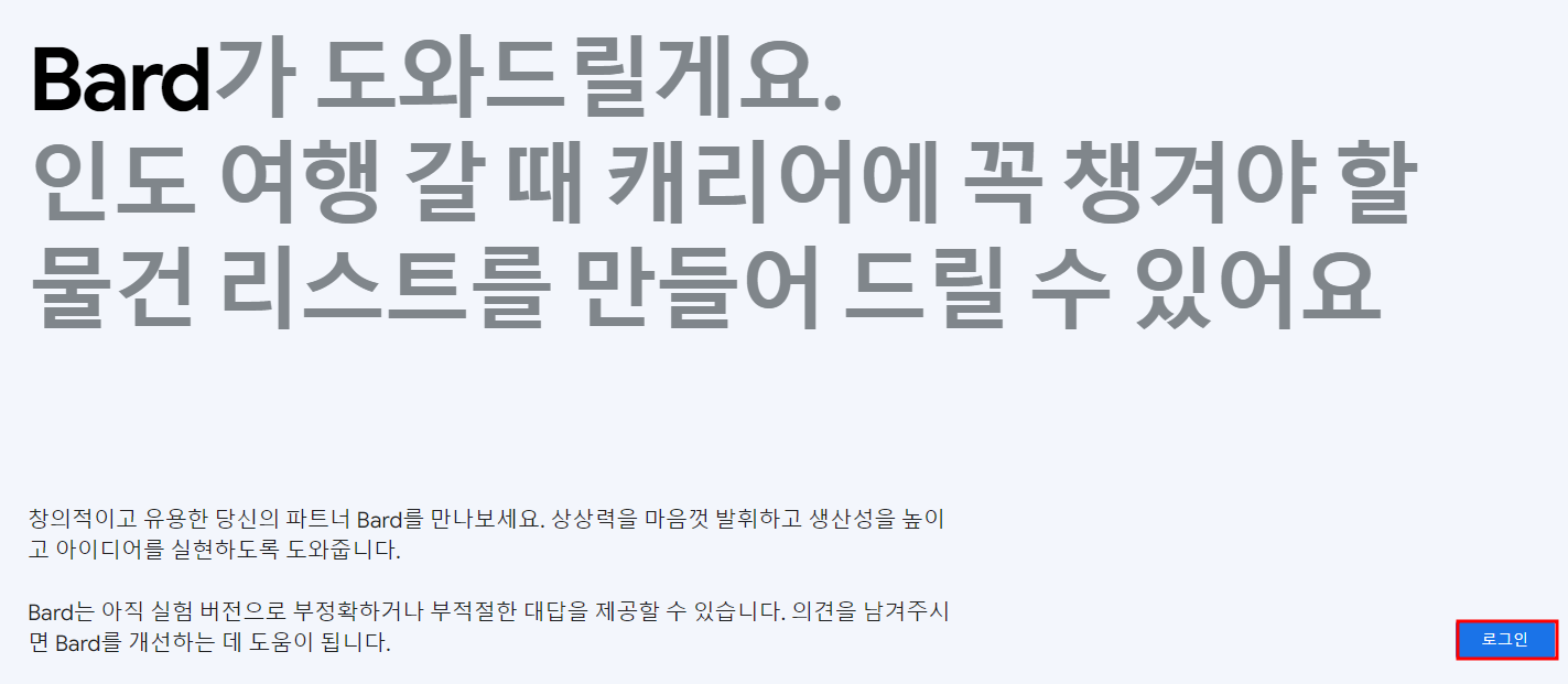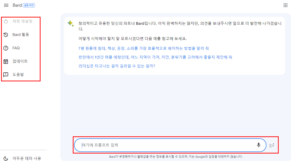 왼쪽 상단을 보면 Bard 실험 버전이라고 써져있다.