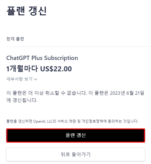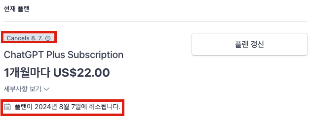 7. 플랜이 잘 취소된 걸 볼 수 있다. 언제까지 ChatGPT Plus를 이용할 수 있는지도 나온다.