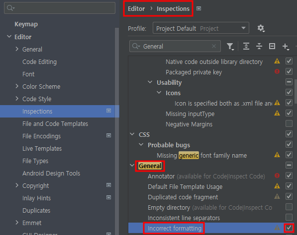 Settings/Preferences - Editor - Inspections - General로 이동 -> Incorrect formatting inspection 체크