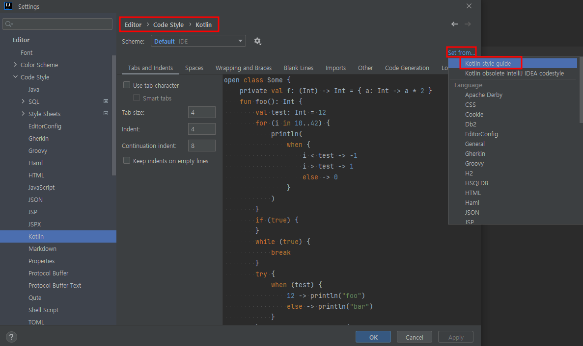 Settings/Preferences - Editor - Code Style - Kotlin으로 이동 -> Set from...클릭 -> Kotlin style guide 클릭