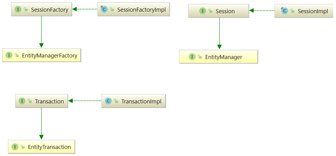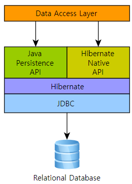 Jakarta Persistence 제공자로서, Hibernate는 Java Persistence API 사양을 구현하며 Jakarta Persistence 인터페이스와 Hibernate 특정 구현 사이의 연관 관계는 다음 다이어그램으로 시각화할 수 있습니다: