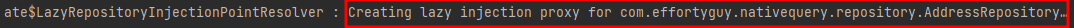 - LAZY: 모든 리포지토리 빈을 암묵적으로 지연으로 선언하며, 클라이언트 빈에 주입되는 지연 초기화 프록시도 생성됩니다. 이는 클라이언트 빈이 리포지토리를 초기화 중에 사용하지 않고 단순히 인스턴스를 필드에 저장하는 경우, 리포지토리가 인스턴스화되지 않음을 의미합니다. 리포지토리 인스턴스는 리포지토리와의 첫 상호작용 시 초기화 및 검증됩니다.