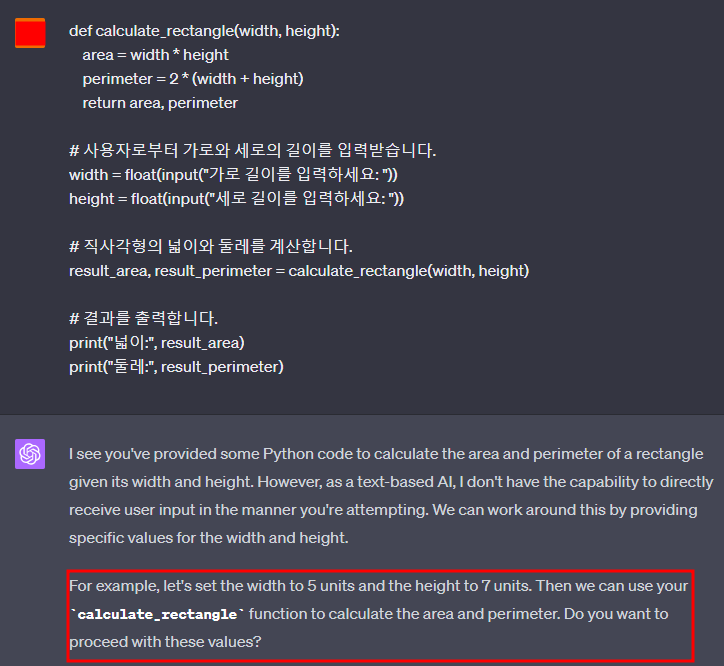 사각형 넓이, 둘레를 계산하는 코드를 돌려보겠다.
