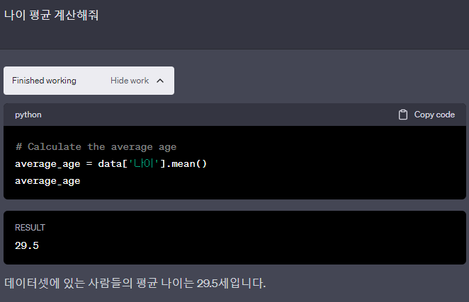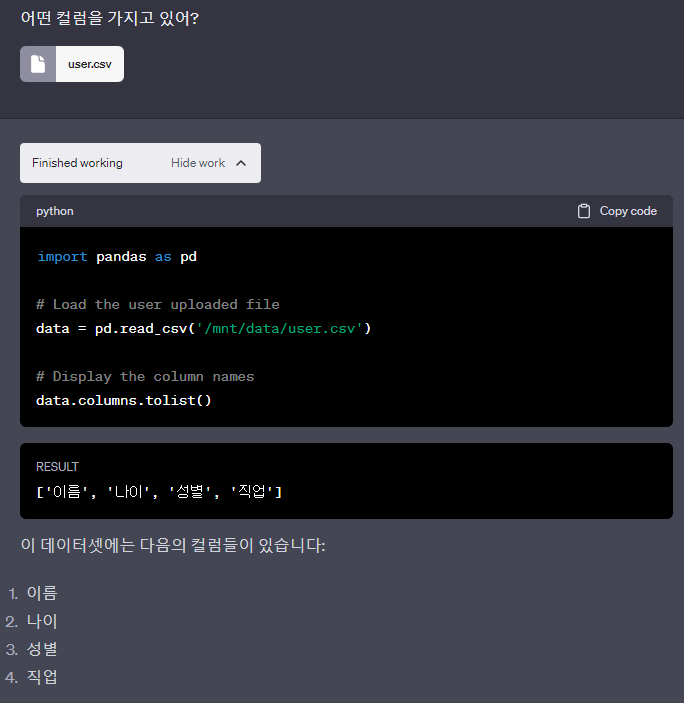 이제 저 파일에 있는 정보를 분석해서 컬럼 종류, 나이 평균를 구해달라고 해보겠다.