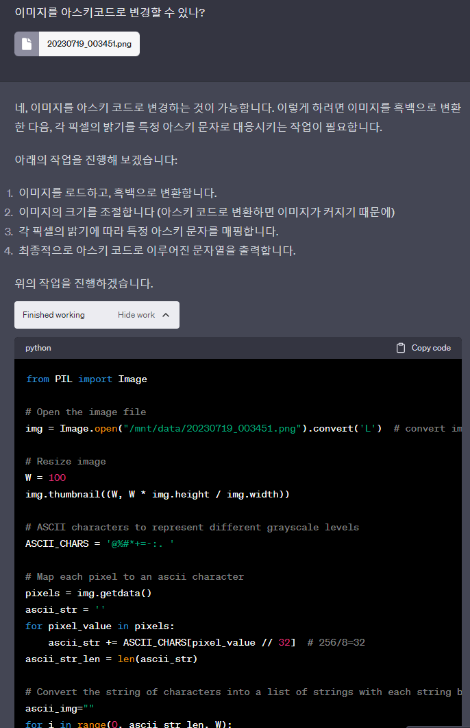 이미지를 아스키코드로 변환하는 절차를 먼저 알려주고 작업을 해준다.