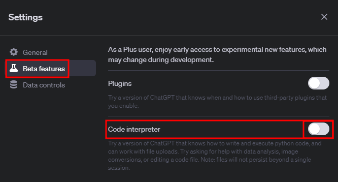 2. Beta features -> Code interpreter 클릭