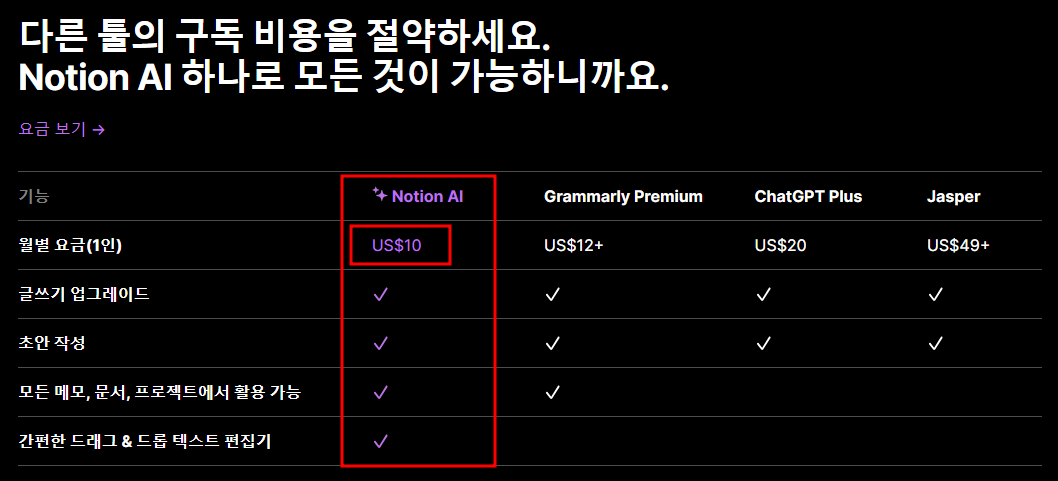 Notion AI 공식 홈페이지를 보니 월 10$만 내면 사용할 수 있다고 한다.