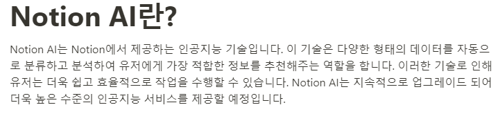 | Notion AI는 내가 정리해놓은 글을 Notion AI를 통해 다듬거나 정리할 때 사용하면 딱일 거 같다. Notion AI로 어떤 글을 처음부터 창작하는 용도로는 잘 안 쓸 꺼 같다. |