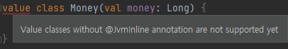 inline class는 class 앞에 inline을 붙이지 않고 @JvmInline 어노테이션을 붙여야 한다.
