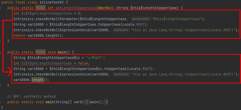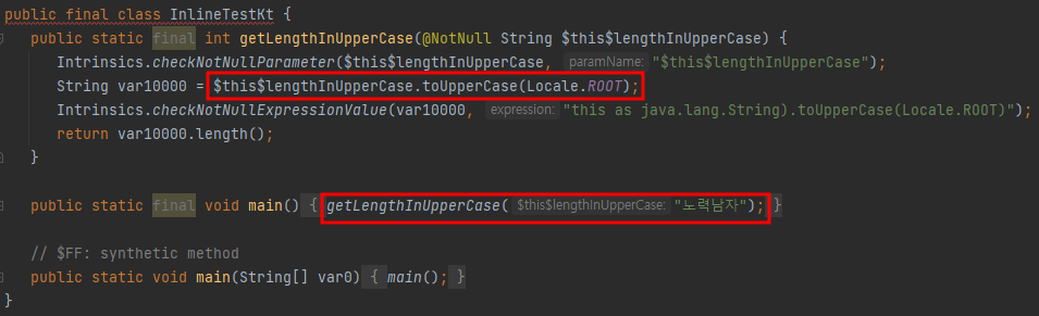 inline을 붙여주니 String.lengthInUpperCase를 호출하지 않고 바로 this.uppercase().length를 호출하는 걸 볼 수 있다.
