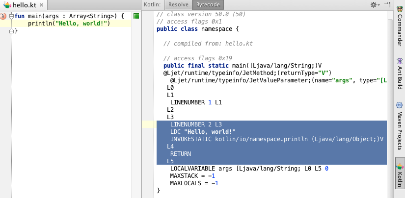 IDEA 창의 오른쪽 가장자리에 있는 Kotlin 버튼을 클릭하고 "Bytecode" 탭을 선택하면, 프로그램에 대해 Kotlin이 생성하는 바이트 코드를 볼 수 있습니다!