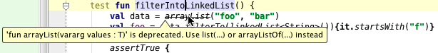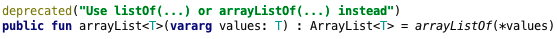 한 글자의 차이가 의미를 크게 변화시킵니다. 그래서 이제 arrayList()는 더 이상 사용되지 않고, 새로운 arrayListOf()가 사용 가능합니다. 또한 새로운 list() 함수도 있어서 이것도 어레이 리스트를 생성하지만 읽기 전용 참조로 반환합니다. 따라서 이제 arrayList()의 선언은 다음과 같이 보입니다: