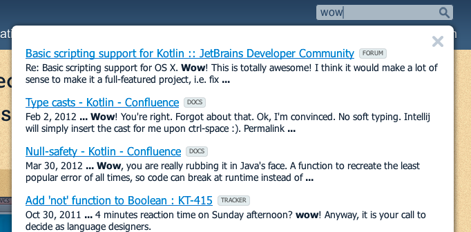Kotlin 홈페이지는 이제 문서, 포럼, 트래커, 소스 코드 등을 종합하는 통합 검색 상자를 제공합니다.