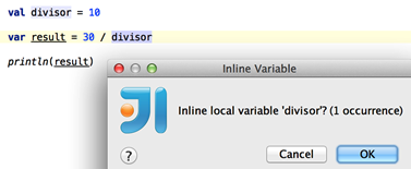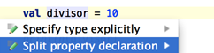 Kotlin은 프로퍼티를 선언 시 초기화할 수 있습니다. 이제 IntelliJ IDEA에서 이를 두 개의 별도 표현식으로 쉽게 리팩터링할 수 있습니다(Split property declaration 의도 사용) 또는 다시 하나로 합칠 수 있습니다(Edit | Join Lines 사용).