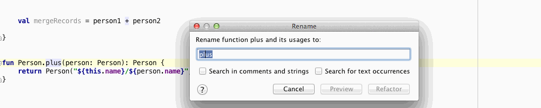 Kotlin은 연산자 오버로딩을 허용합니다. 예를 들어, 우리는 +를 오버로딩하기 위해 plus라는 이름의 함수를 생성할 수 있습니다. 이제 이러한 이름을 바꿀 때 IntelliJ IDEA는 자동으로 해당 사용들을 모두 바꿔줍니다.