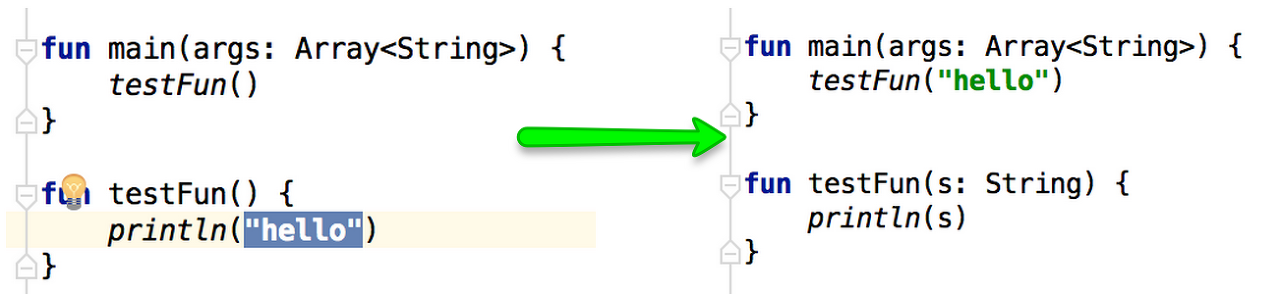 Kotlin IDE는 이제 선택한 함수 내부에서 표현식을 매개 변수로 변환하는 표준 Introduce Parameter 리팩터링을 지원합니다: