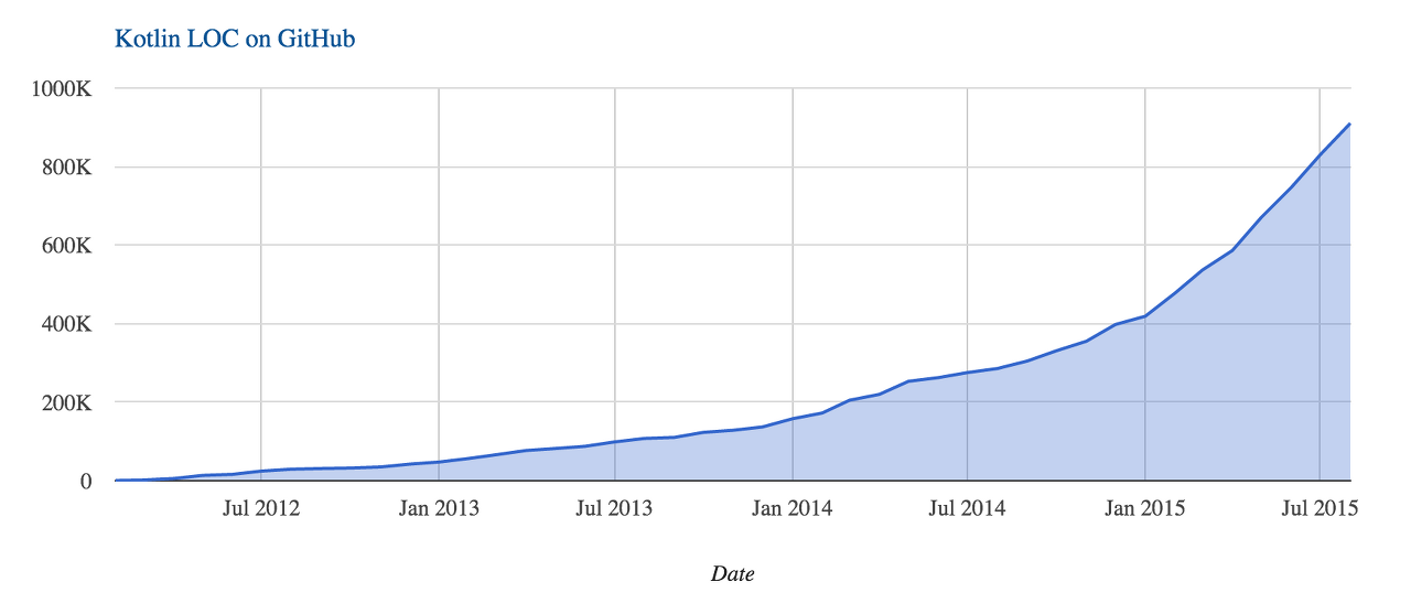GitHub의 공개 저장소에 있는 Kotlin 코드 줄 수는 현재 기하급수적으로 증가하고 있습니다(JetBrains의 프로젝트는 제외됩니다):