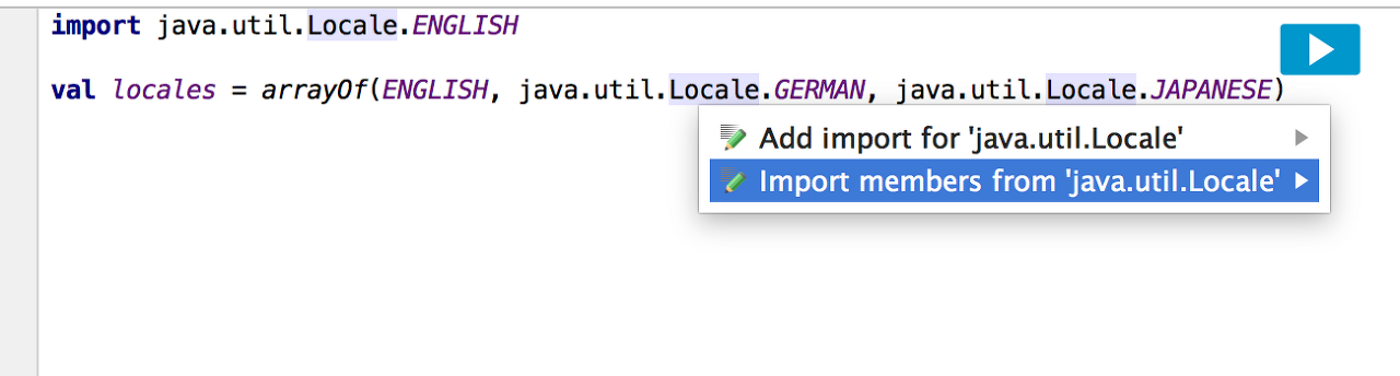 - 마지막으로 Java 정적 멤버, 객체 멤버 및 열거형 항목을 가져오기 위한 의도 작업이 추가되었습니다. 또한 Java 클래스의 정적 멤버 또는 열거형 클래스의 항목을 *-import하는 유사한 작업이 있습니다.