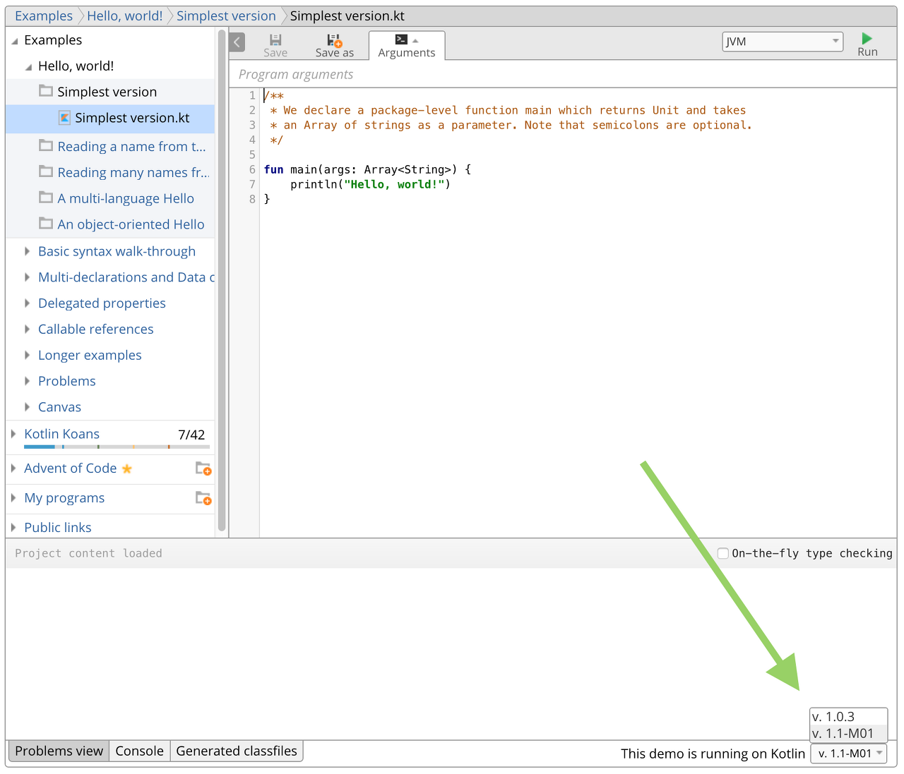 try.kotlinlang.org에서. 하단 오른쪽 모서리의 드롭다운 목록을 사용하여 컴파일러 버전을 변경할 수 있습니다.