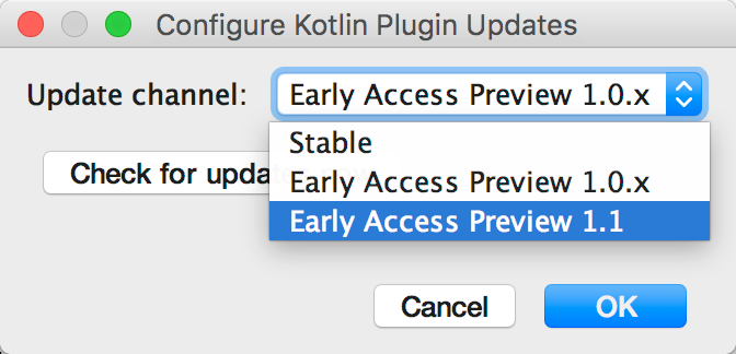IDE에서. Kotlin 1.0.3을 실행 중이라면, Tools → Kotlin → Configure Kotlin Plugin Updates로 이동한 다음 Update channel 드롭다운 목록에서 "Early Access Preview 1.1"을 선택하십시오.